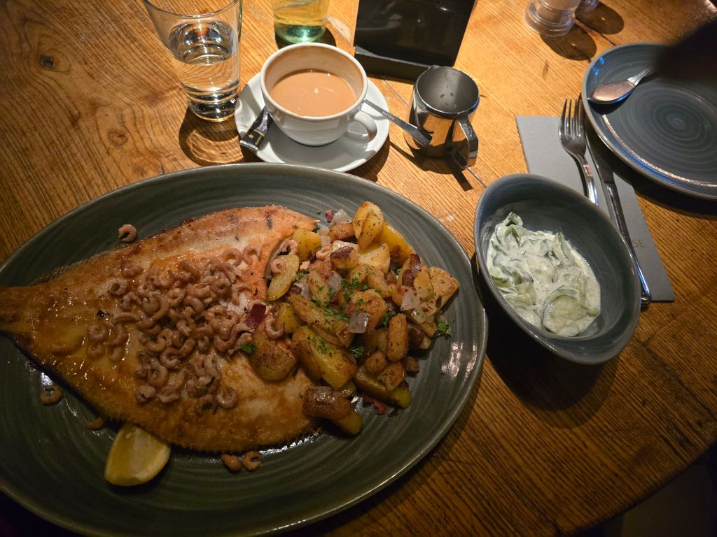 I had North Sea plaice, and these are people who know how to cook fish. There was no salt on it at all. Nobody even appeared in the vicinity of this fish with salt. The cucumber salad had zero salt as well.