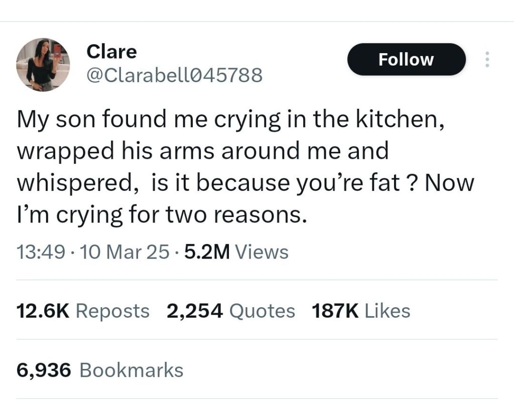 She stole the anecdote from another woman and edited it from a cute and endearing story into “me and my fucked up kid” story. Five million views, 187,000 likes. The woman is thin as a washboard. The story is obviously fake and not even funny in this telling.