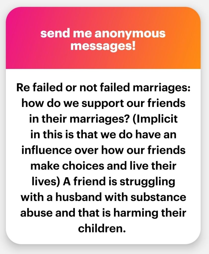 Friends can offer to help take care of kids…or not offer to do that. Friends can offer to help financially or not offer to help. Friends can tell their friends that their feelings matter, or tell their friends that their feelings don’t matter and money/materials matter more. Friends can also encourage their friends to stay with the addict for social appearances sake and then have an affair on the side. Lots of possibilities!