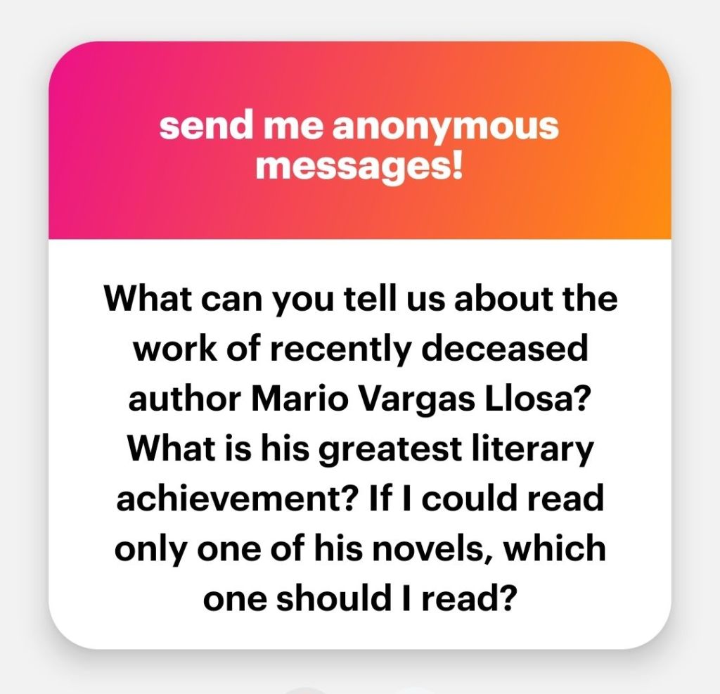 Dude, I’m so traumatized, I walk around dark as a storm cloud in May. Yes, Llosa was 89 but still. Did I mention that I met him in person? I mean, I know I did, but have I mentioned it recently? A hard-working person and a truly great writer, even if his personal life was very ridiculous (see HERE and also HERE. And HERE, as well).