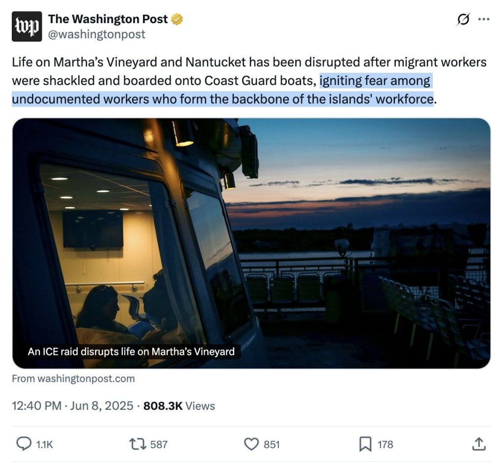 The rich denizens of Martha’s Vineyard keep lecturing us about the plight of African Americans yet they have brought in illegals because they don’t have to pay them as much as they would have to pay black citizens.