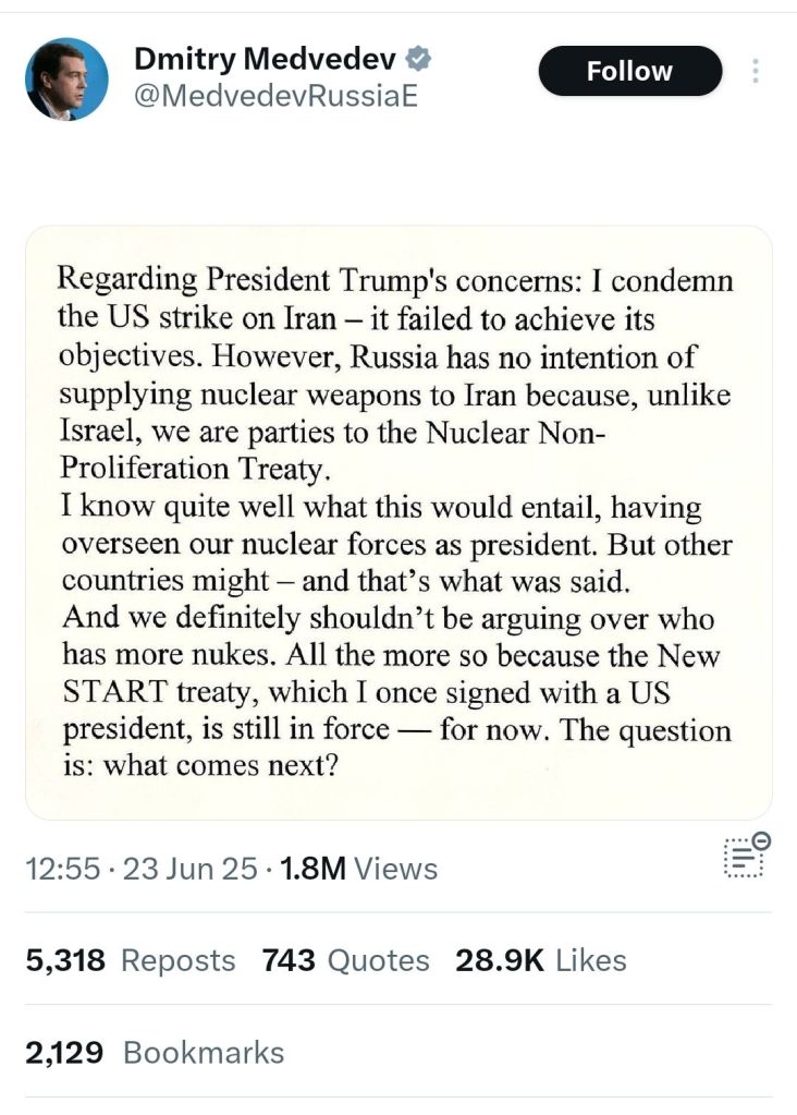 So the likely scenario is for them to see medvedev’s bowing and scraping as russia becoming normal again (rather than his first tweet being a more accurate depiction of russian values and goals).