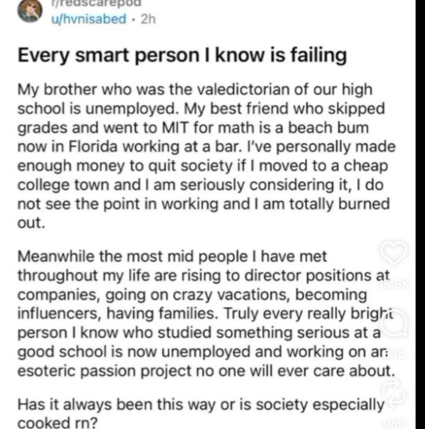 There’s also the idea that the people the post is describing are…. fast plodders? That is they breeze through conventional education by following directions but then are kind of helpless when they have to find solutions on their own and they really don’t do well in unstable changing job markets.