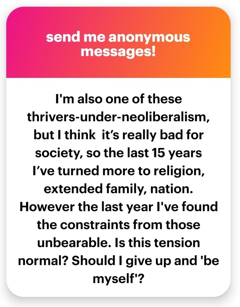 Yes, you should stop and do what’s natural to you. You aren’t helping anybody by torturing yourself. There are other ways to help which are much more effective. The road to finding those ways lies through inhabiting your neoliberal self as fully as possible because that’s how you’ll know what it’s really like and why it won’t work for many people.