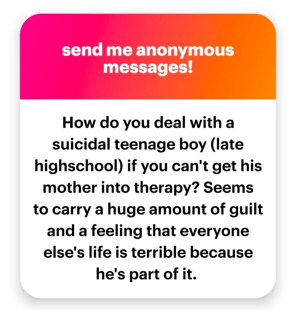I’m honestly not sure how to get him into private therapy (I could pay for it, he’d never accept it though). I try to get him out of town as much as possible during the weekends, and trying to be an elder female figure in his life that’s stress-lowering – mistakes can be made with me without it either being the end of the world or something that I magnanimously forgive him for, so to say, I’m very honest and open but not self-flagellating about the times when I fuck up (with him or in third-party situations) and I sometimes need help with hobby-related stuff that he can do without great difficulty, so when he’s having an I’m-terrible-for-everyone-in-my-life moment I can honestly say nah, you’ve actually helped me out, here’s the receipts.