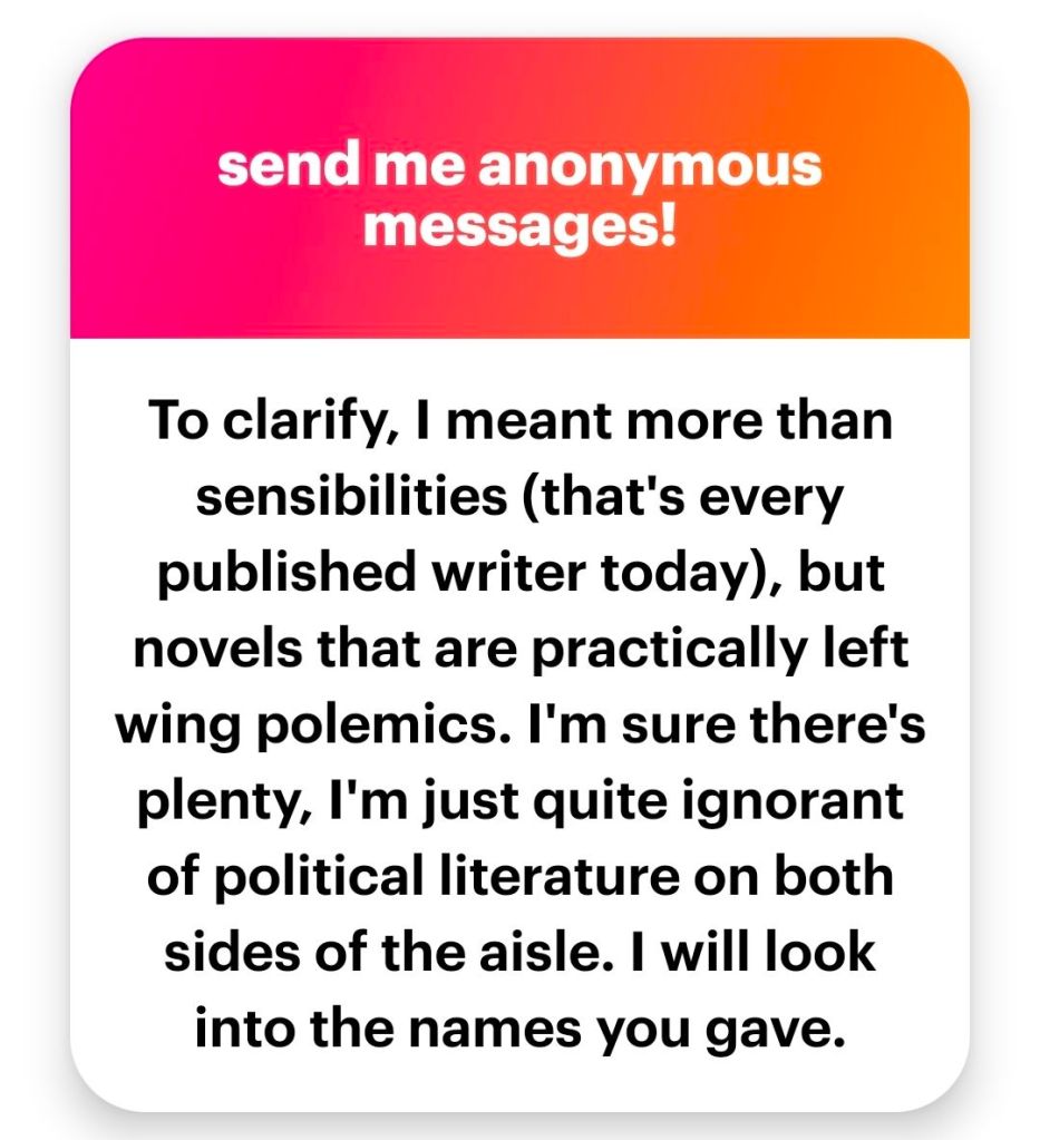 OK, now I get it, thank you. Yes, there’s a large amount of literature that’s downright political messaging with no additional value. Think poetry by Amanda Gorman. It’s bad, there’s not a spark of talent in it but she gets promoted because it’s politically useful.