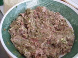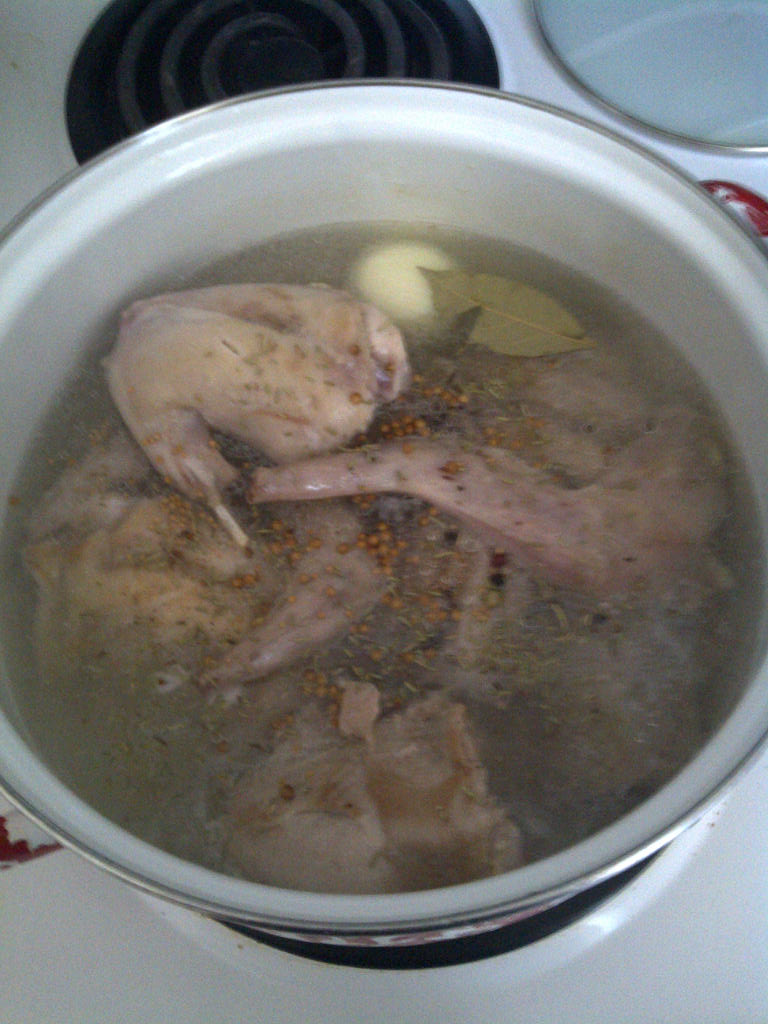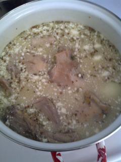 2. Place the peas in 8-10 cups (according to how thick you like your soup) of bouillon. Lacking that, you can always use water (salted to taste). Using water instead of bouillon means you can be more generous with herbs and spices. Bring the peas in bouillon to a gentle boil, and let them simmer. They will stay simmering for 3-3,5 hours, so you will have time to prep all the other ingredients (and blog in the meanwhile) at leisure.
