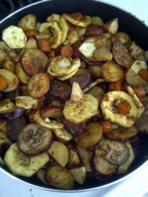 I dice the carrots first, then the turnip, and after that the potato, and add them to the cooking pot in that order. Vegetable can be cut in pretty large pieces, but all chunks should be of uniform size because otherwise