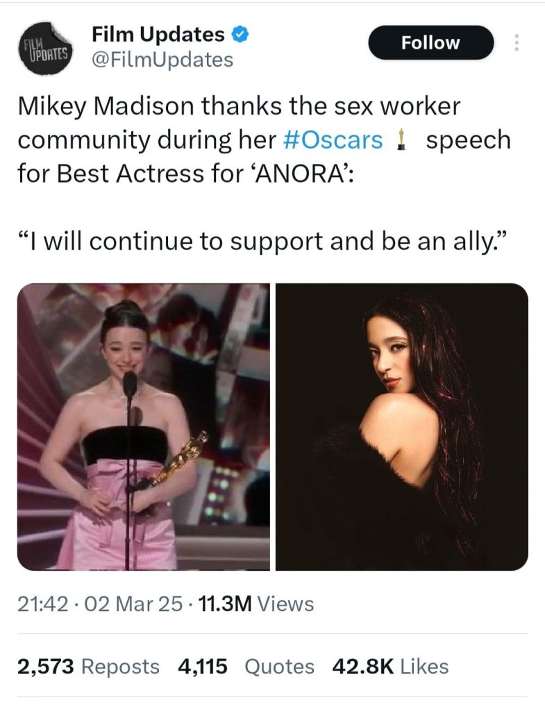 A movie that stars a Russian propagandist and war criminal and glorifies prostitution. An actress that makes a speech saying she supports prostitutes. I don’t know how exactly she supports them and I’d rather not find out but this degeneracy is off-putting.