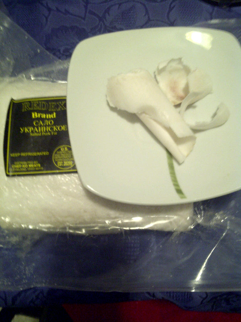 I hadn’t had a chance to eat salo for over 10 years until we discovered it at a Global Foods store in St. Louis. N. says that he finds seeing me eat salo disturbing because I look like I’m participating in some kind of an erotic activity when I do it.